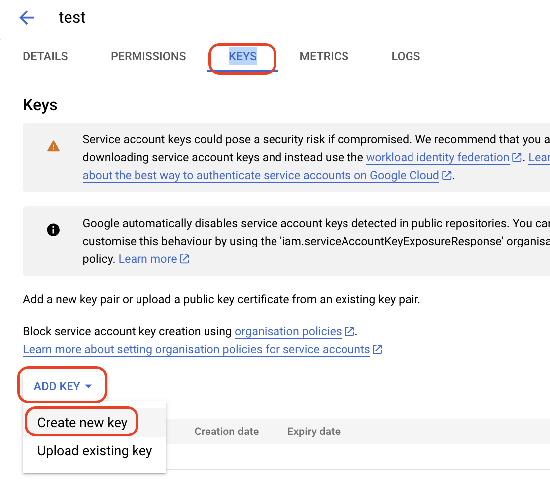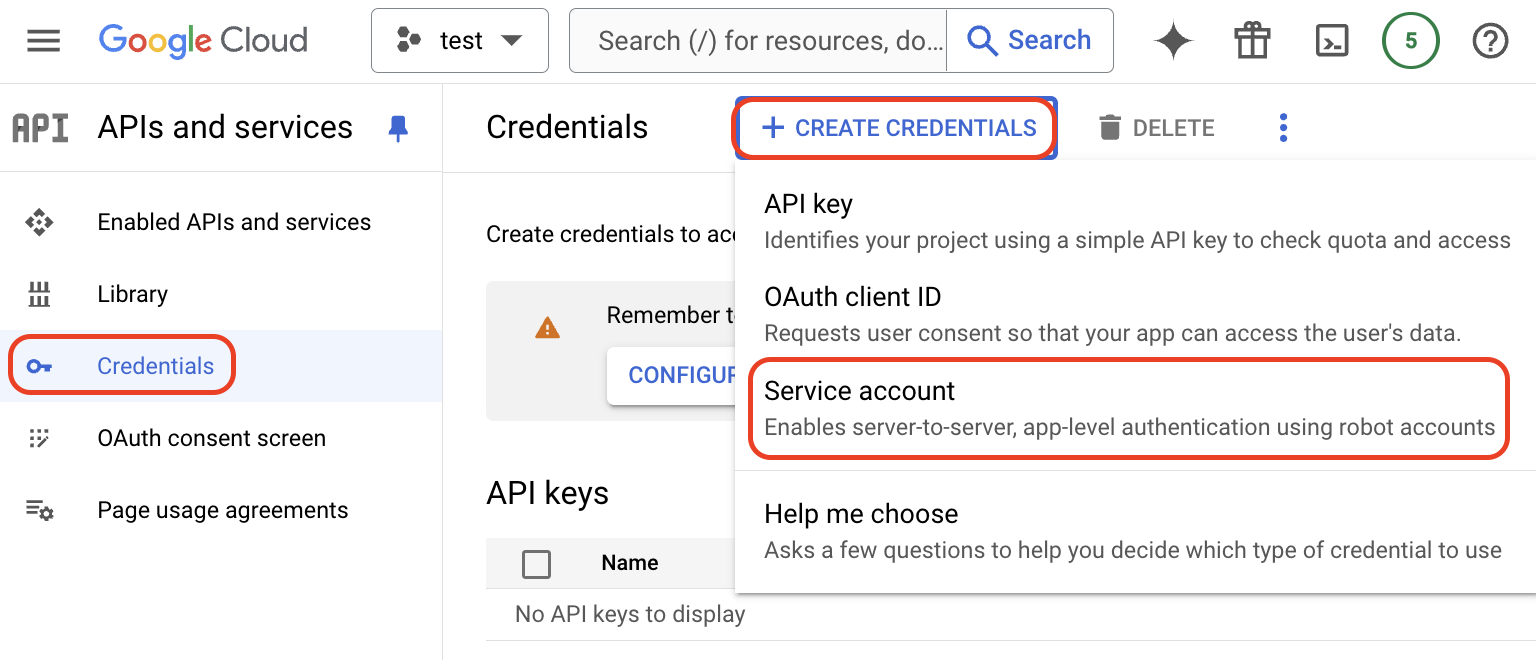 Credentials -> + CREATE CREDENTIALS -> Service Account