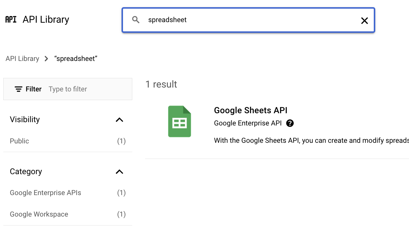 스프레드시트의 데이터를 활용할거니까 spreadsheet 를 검색해서 나온 Google Sheets API 를 Enable 시킨다!