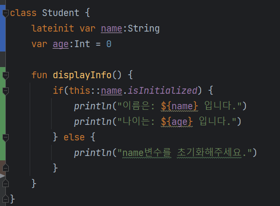 Int 타입의 변수 age 와 nullable 에 lateinit 선언을 해줬더니 위와 같은 오류가 뜬다.