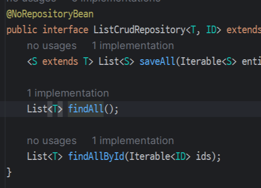 Crud 메소드, 페이징과 정렬 메소드 등이 제공되는 걸 알 수 있다.
