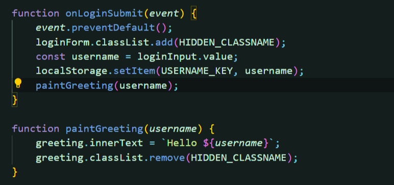 이 IF 문의 함수 paintGreeting 은 변수 savedUsername 을 '인자'로 받아서