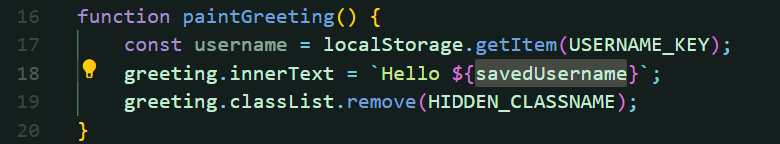 함수 paintGreeting 내의 innerText 값으로 바로 savedUsername을 넣었더니