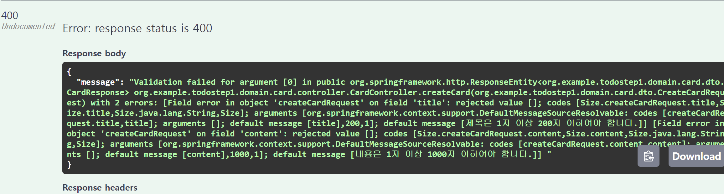 기능실패 400 코드와 메시지가 잘 반환되는데 원래 이렇게 기나?! 이런 경우 친절한 에러메시지를 작성하기 위해 커스텀한다고 하는데 정확히 어떤 형식으로 하는지 잘 모르겠다.