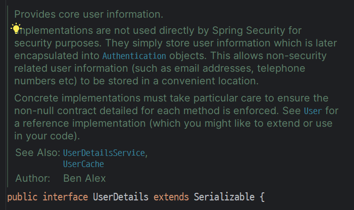 UserDetails는 Spring Security에서 사용자 정보를 저장하는 인터페이스로, 실제 보안 목적으로 직접 사용되지는 않습니다.
