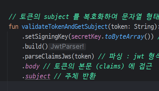 ?.let { tokenProvider.validateTokenAndGetSubject(it) } // 토큰이 유효한지 확인, 복호화